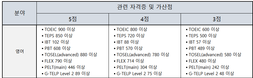 영어검정능력시험의 종류별 가산점이 다르니 확인을 하시기 바라며, 토익 600점이상, 지텔프 level2 48점 이상을 받으신다면 영어 검정제를 통과하실 수 있고 더불어 가산점까지 받을 수 있습니다.