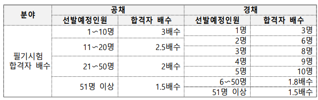 • 합격자 배수 : 필기시험 합격자 배수 인원은 소수점 이하에서 올림함